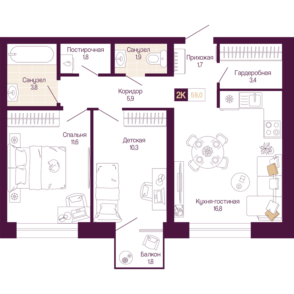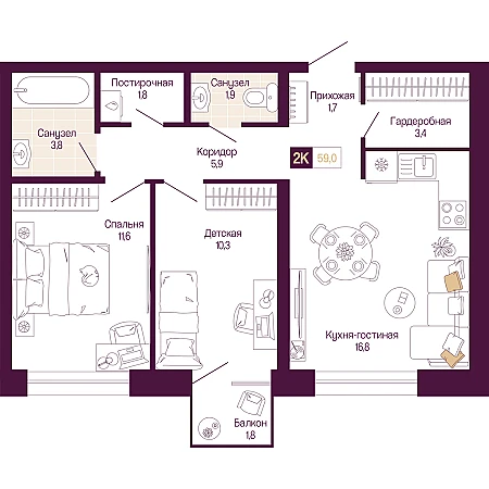 2к квартира 57 м² в ЖК "Идель. Квартал на Сенной"