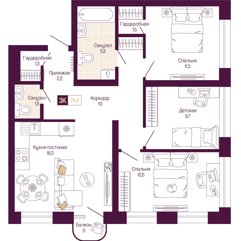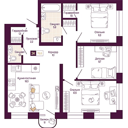 3к квартира 75 м² в ЖК "Идель. Квартал на Сенной"