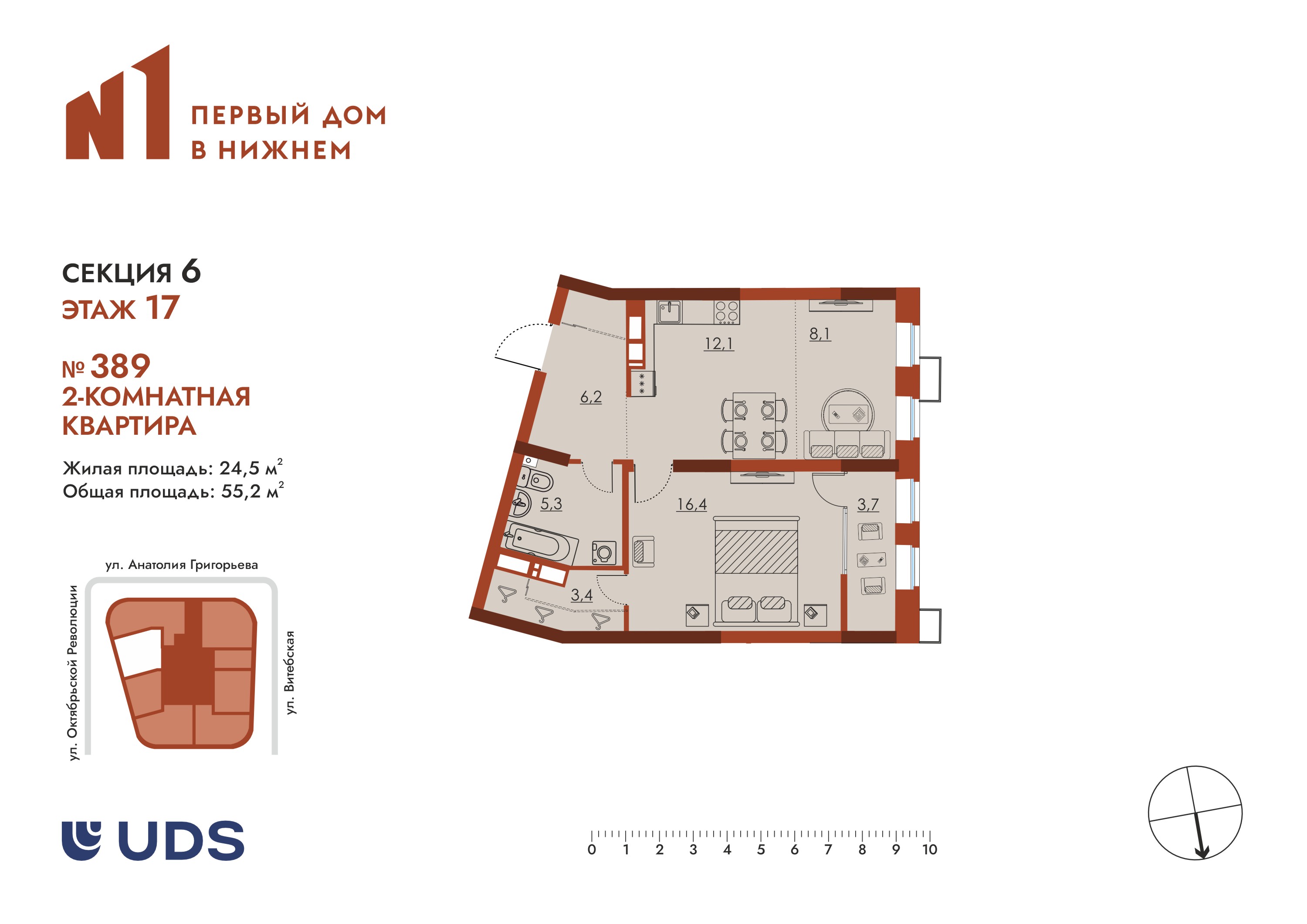 Компактная и вместительная двухкомнатная квартира в 25-этажной секции ЖК «N1 Первый дом в Нижнем»